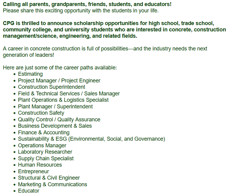 CPG offers multiple scholarships to students pursuing education in concrete-related fields. Awards range from $500 to $2,500, based on: